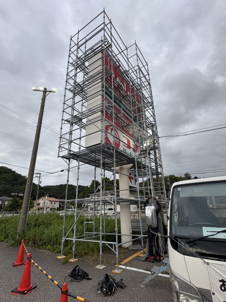 看板撤去時と新設時両方の作業がスムーズに進むように、最善の足場を組立致しました✨