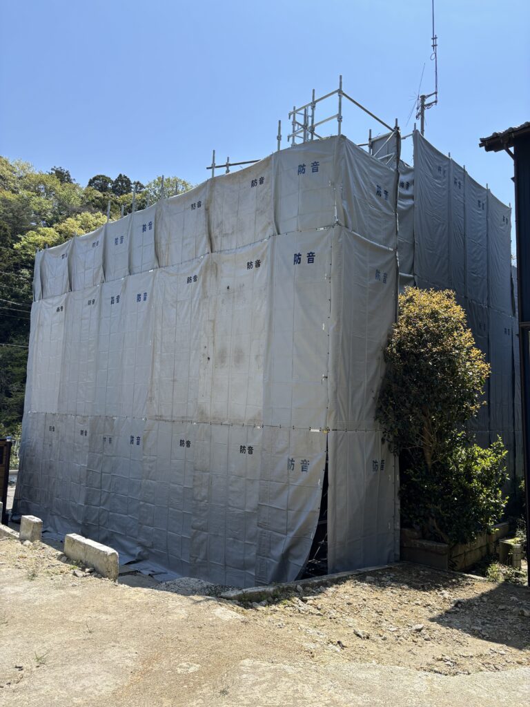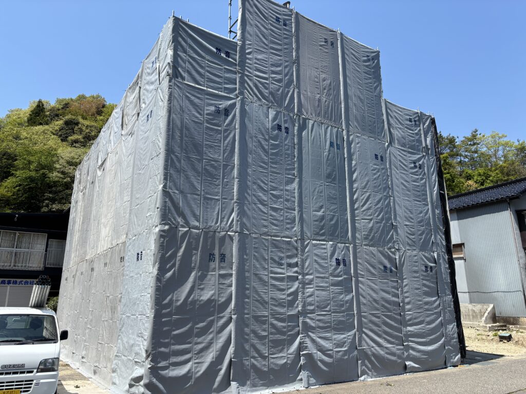 石川県能登町にて、先日組立した解体養生足場の防音シート張りが終了致しました。