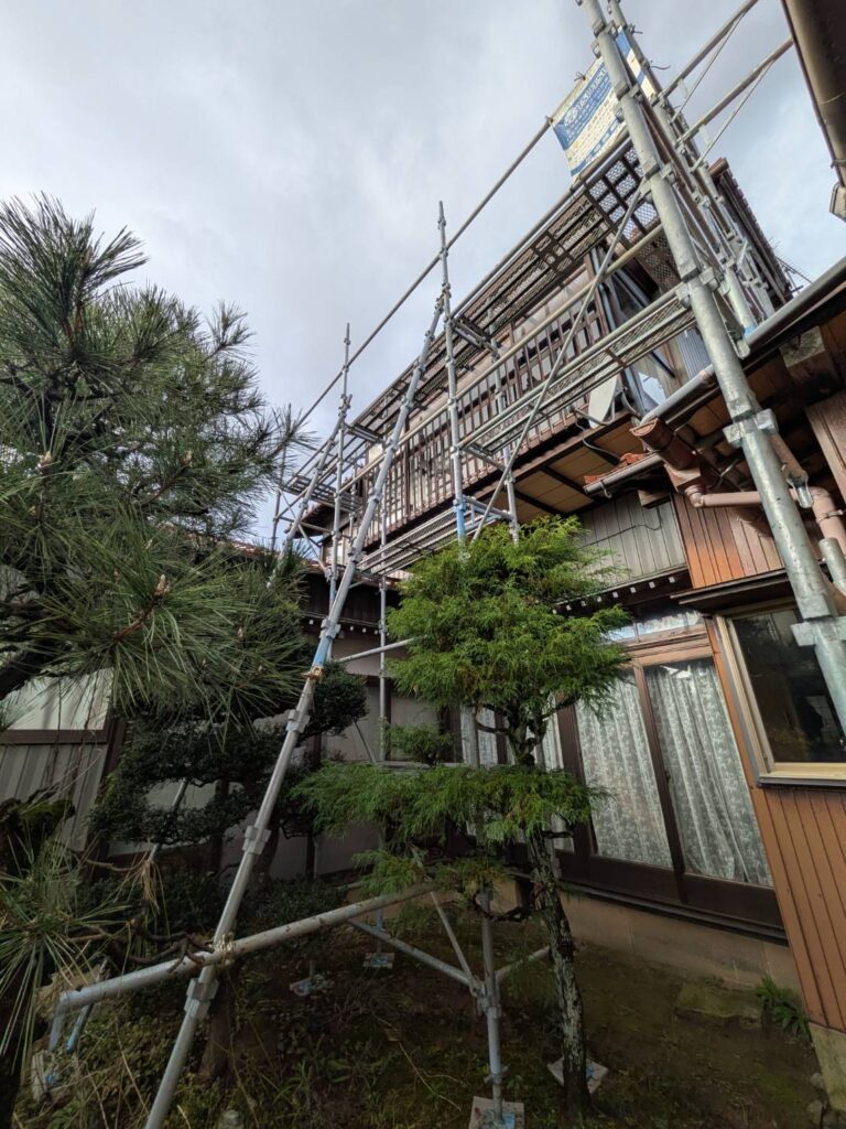 石川県能美市内住宅にて、バルコニー改修用の部分足場を組立致しました☀️