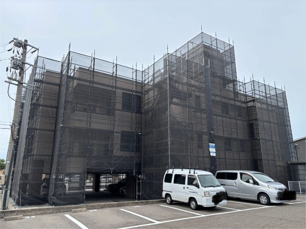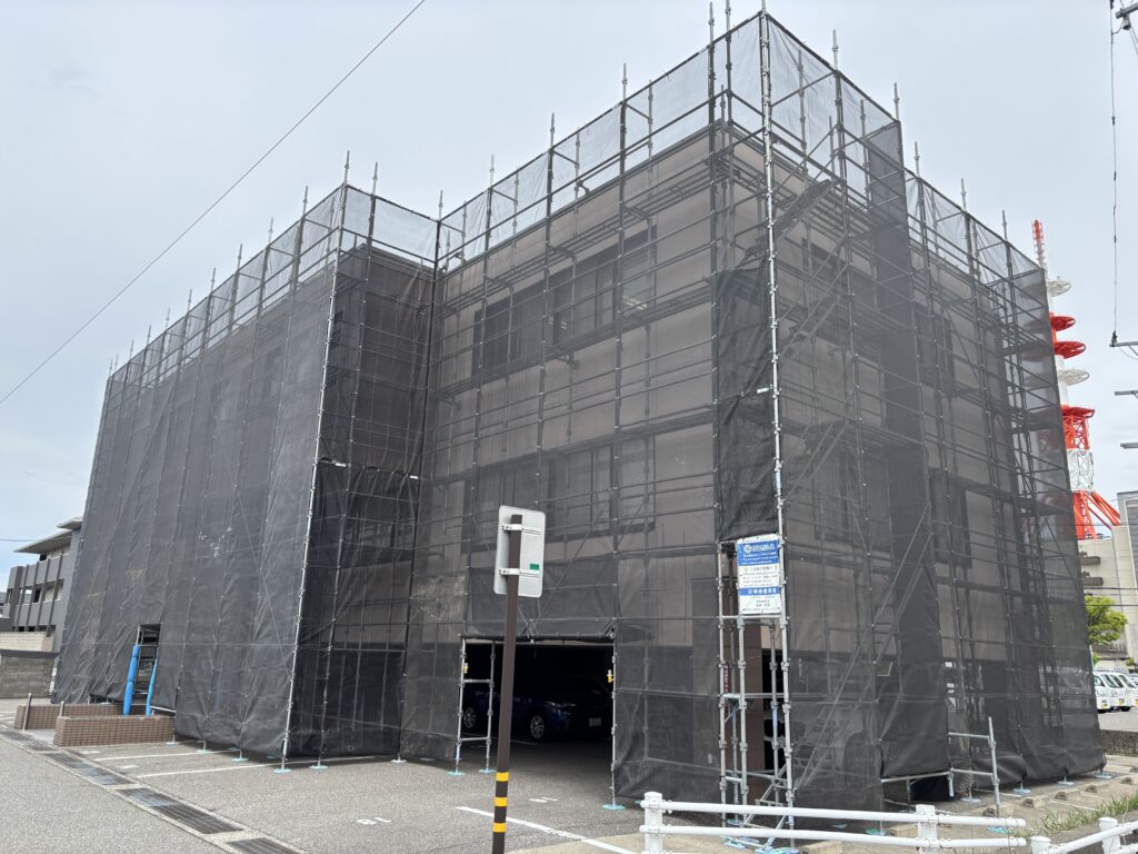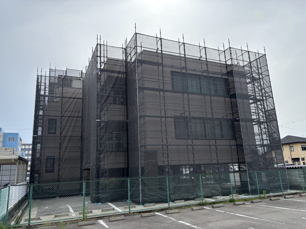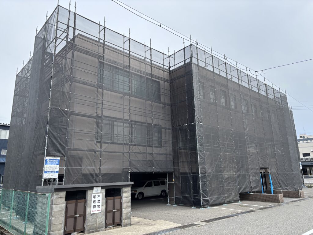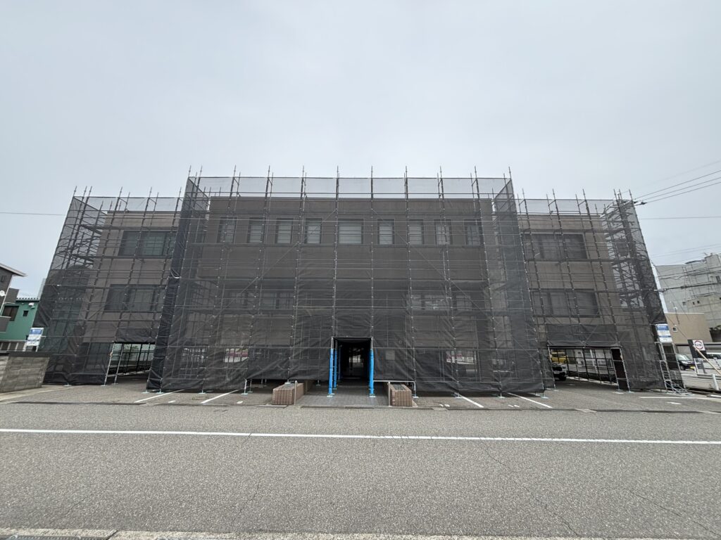 石川県金沢市内にて、ビル外壁改修足場のシート張りを行いました✨