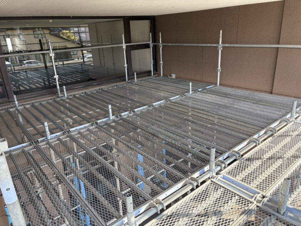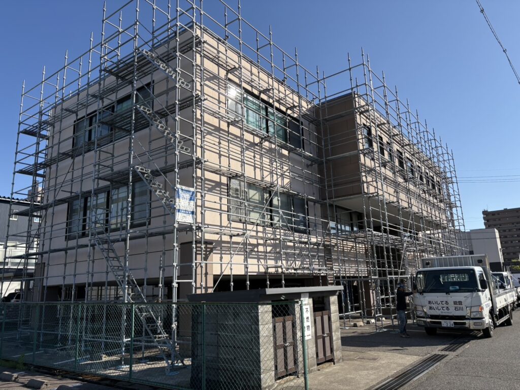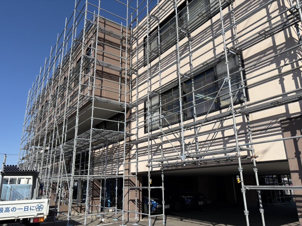 石川県金沢市にて、ビルの外壁改修工事に伴う外部足場の組立を行いました。