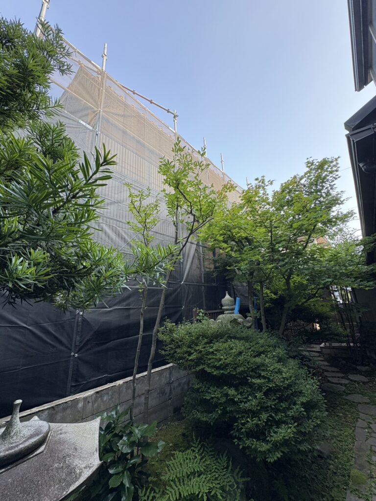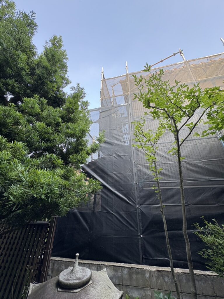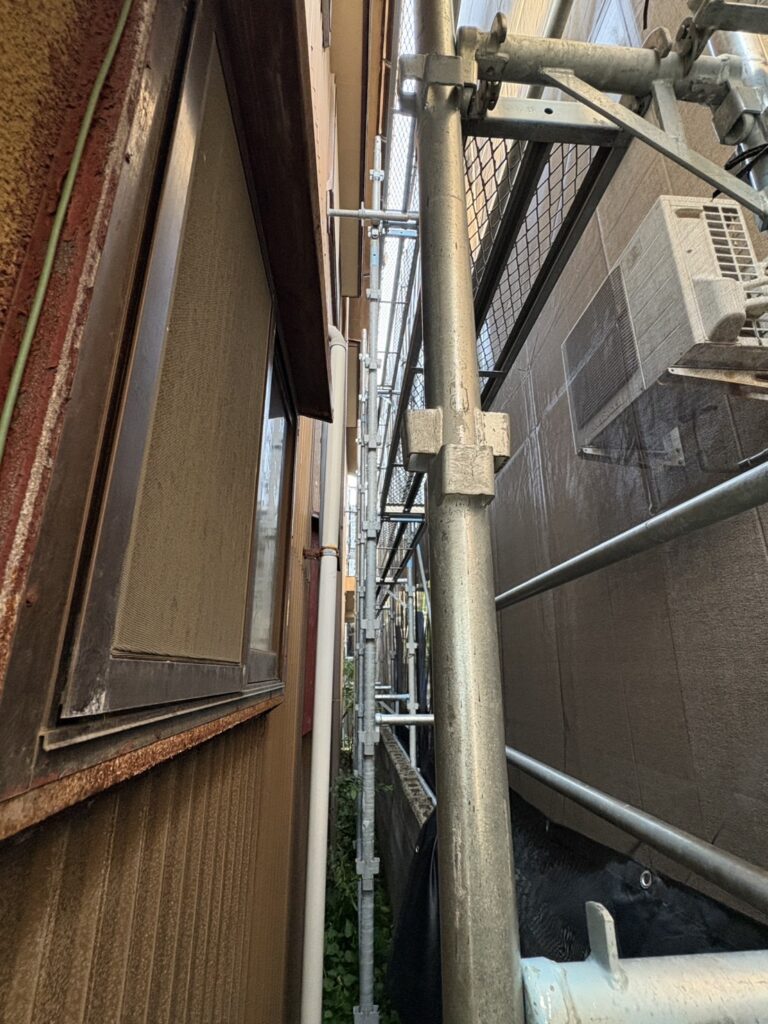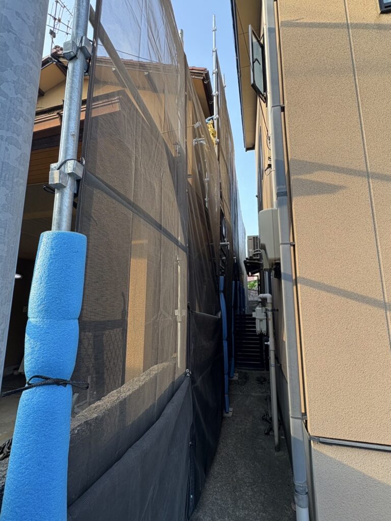 両隣のお家との距離が近く、敷地を越境して足場を組立させて頂きました✨