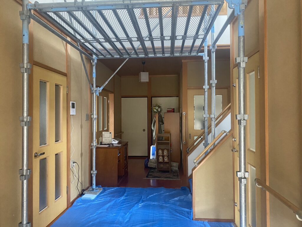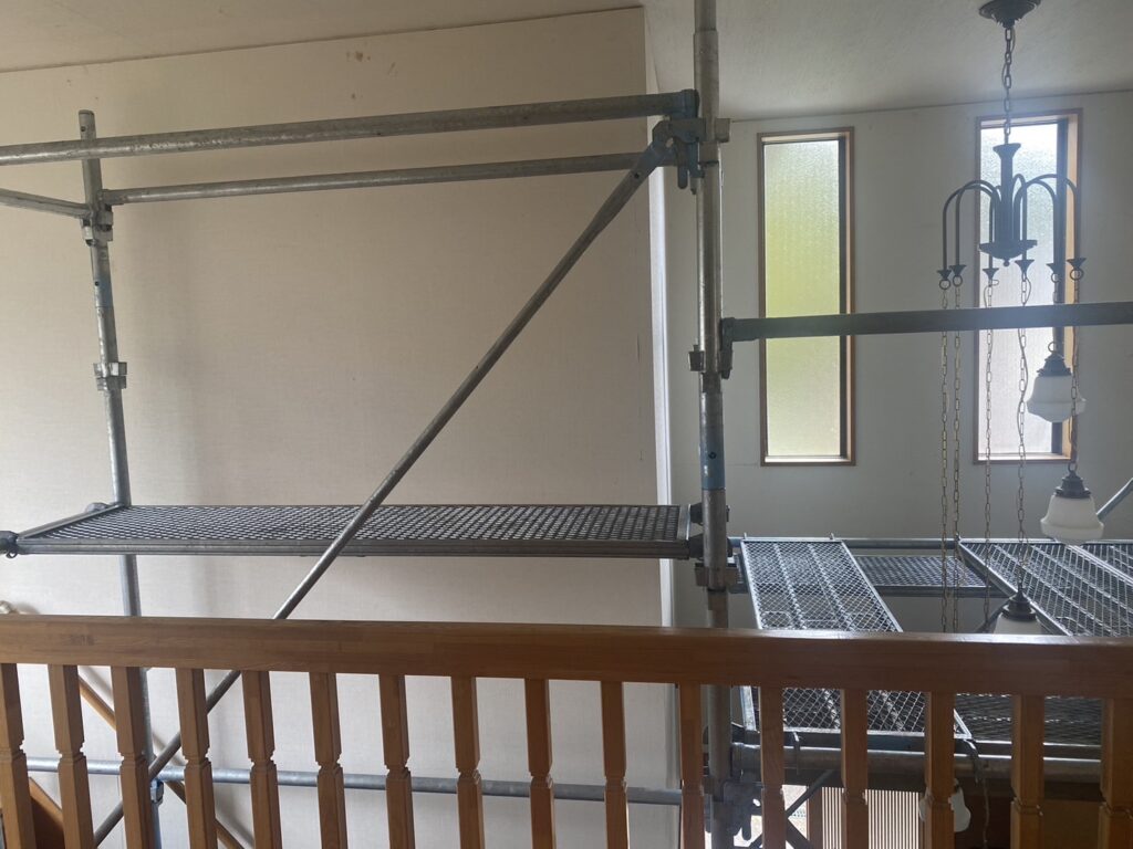 石川県金沢市内にある住宅の壁と天井のクロス張り替えのため、住宅内部に足場を組立致しました。