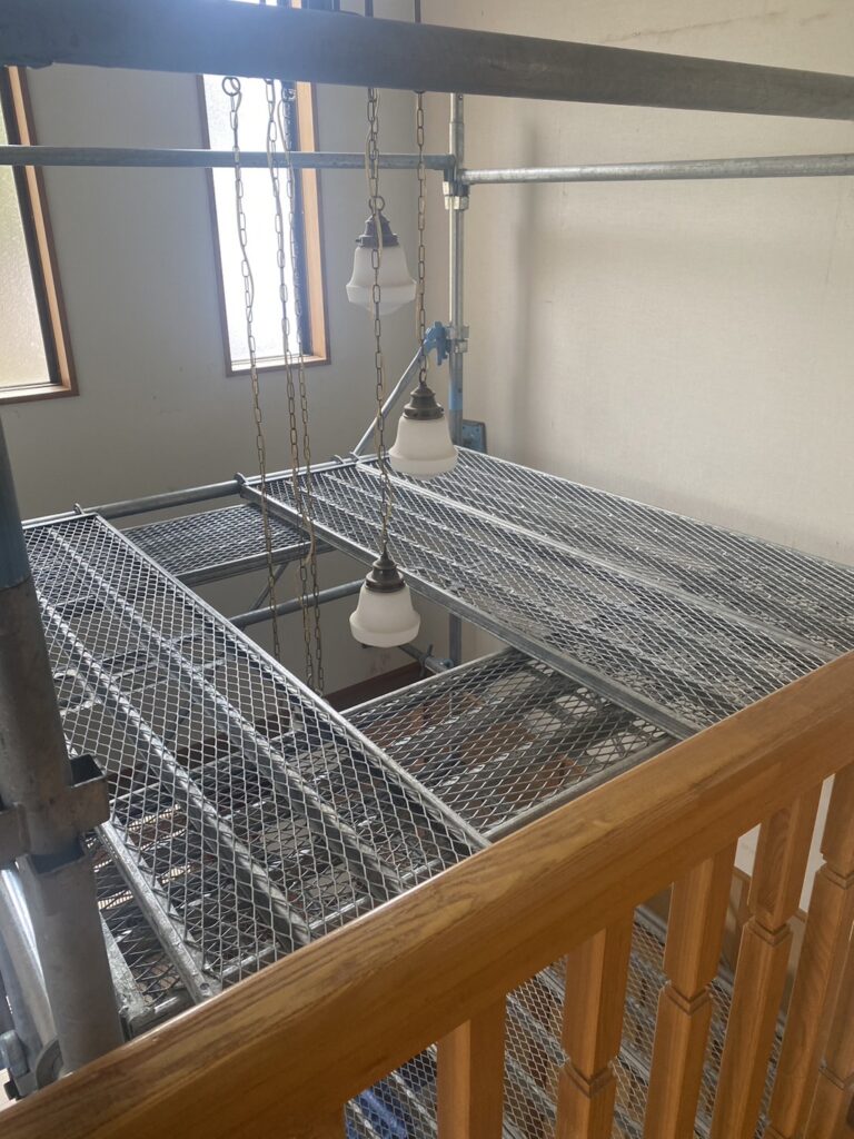 内部足場を施工する際は、ブルーシートや床に接触する箇所に養生等、いつもより細心の注意が必要でしたが、無事完成致しました。