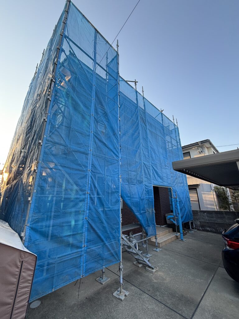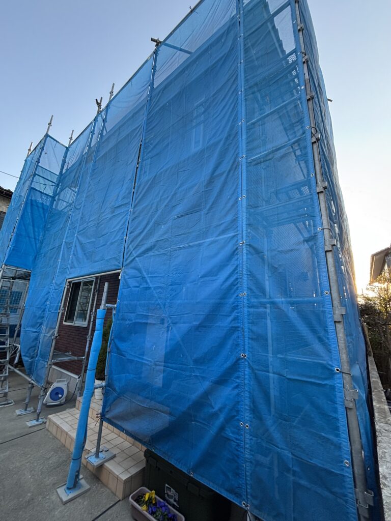 また、塗料やホコリの飛散を防ぐため、建物全体を囲うようにメッシュシートを施工し、近隣への配慮もしっかりと行いました。