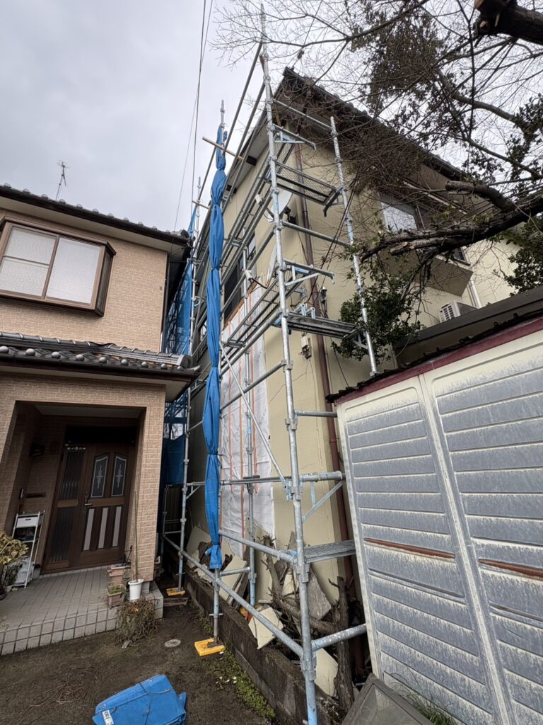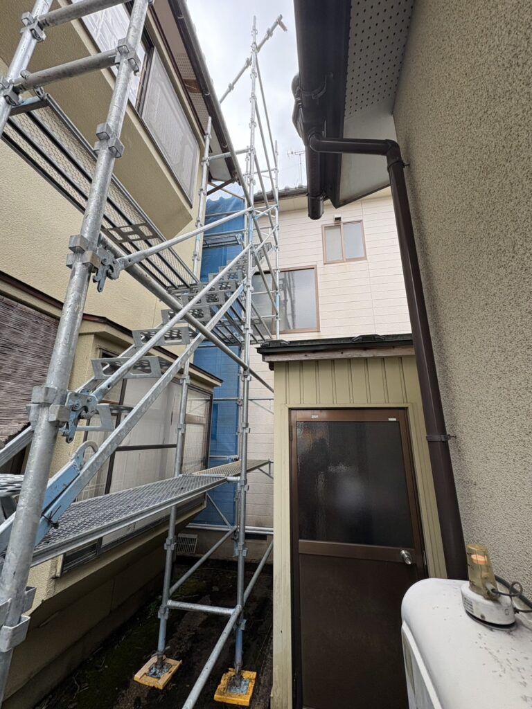 さらに、作業時の安全性を高めるために昇降階段を設置し、職人さんが安心して昇り降りできる動線を確保しました。安全性と作業効率の両立を意識した足場となっています。