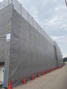 完成した足場も、外部養生シートや層間ネット、開口部のコンパネ養生、侵入防止フェンスなどを施し、安全対策バッチリです👌