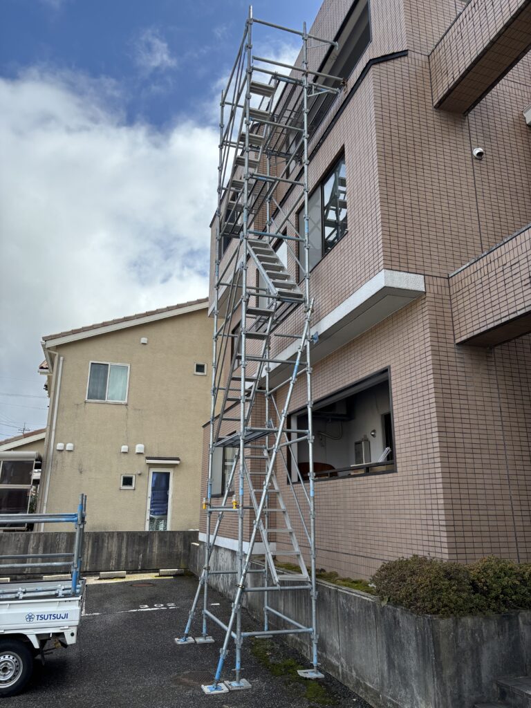 今回は金沢市内にて、三階ベランダの雨漏り工事に伴う昇降足場の組立を行いました。