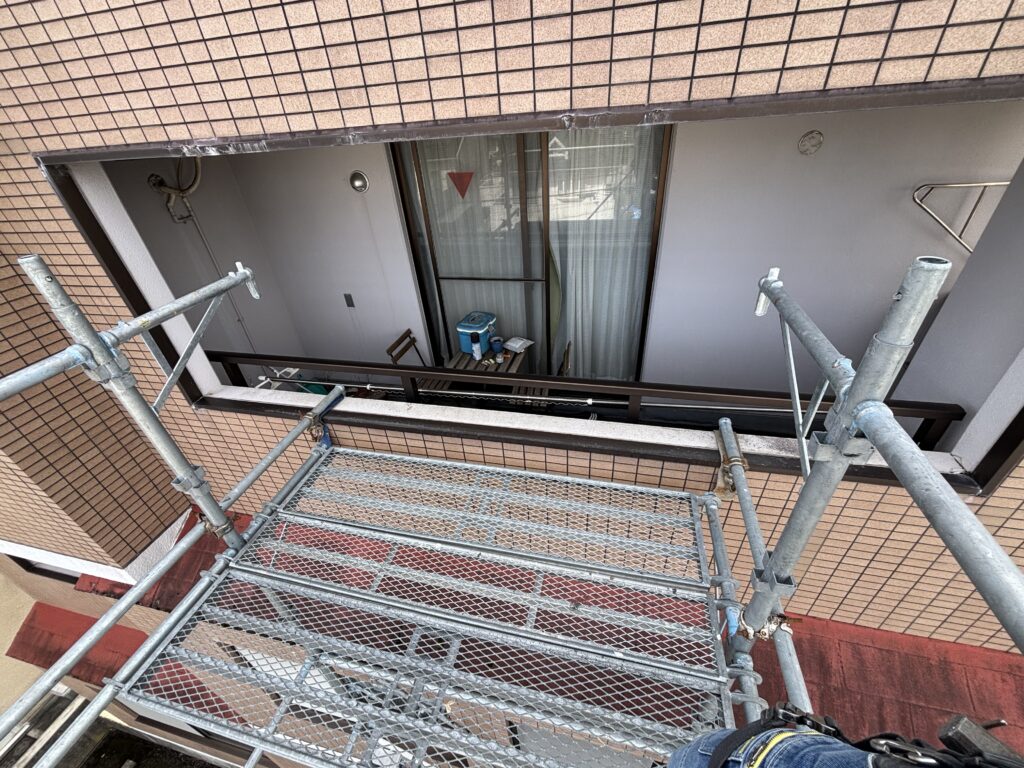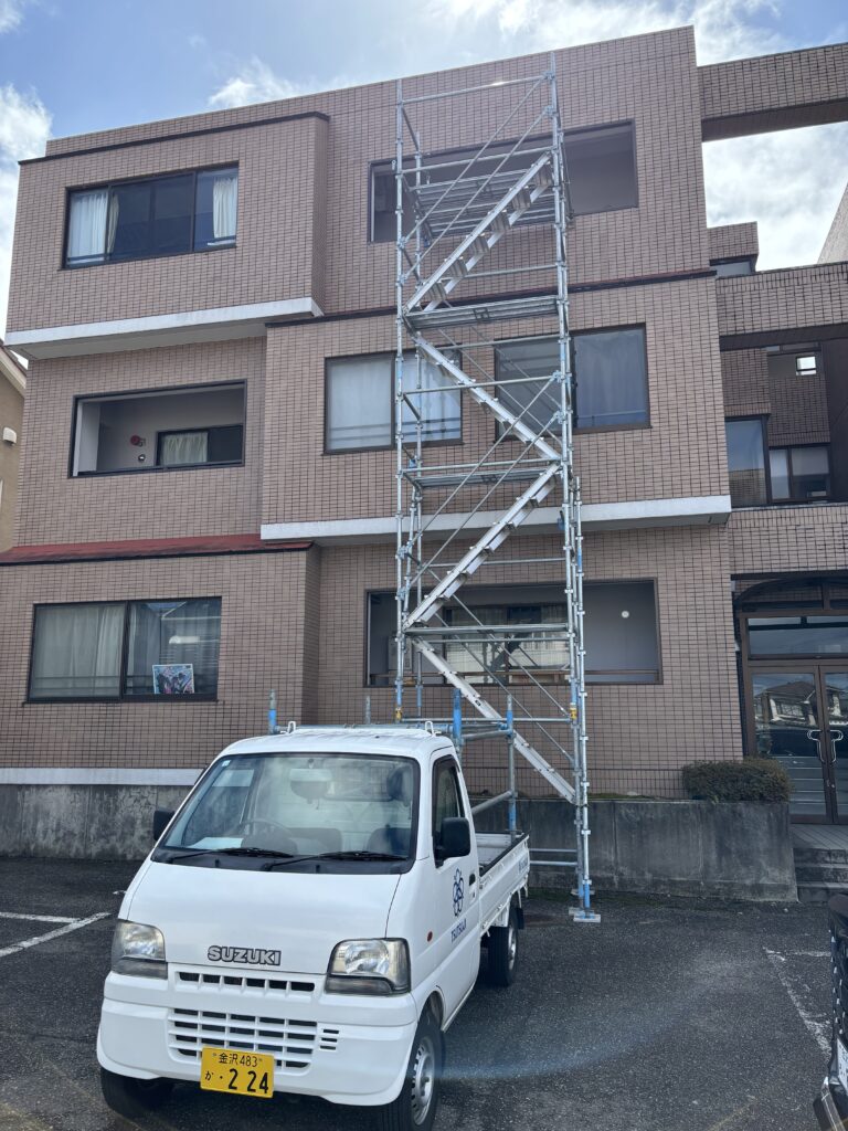 今回は金沢市内にて、三階ベランダの雨漏り工事に伴う昇降足場の組立を行いました。