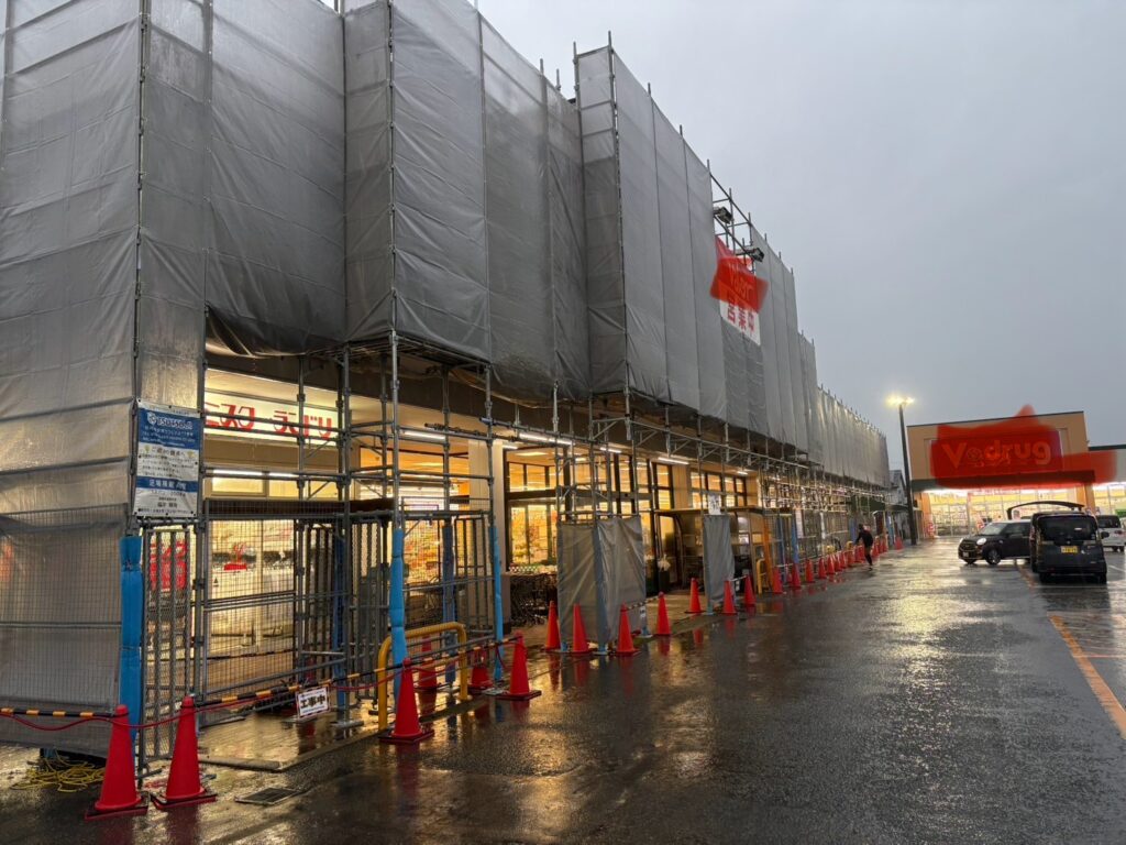 皆さま、お世話になっております。石川県加賀市にて、店舗改修用足場を組立致しました。作業中はガードマンを配置してお客様への配慮を十分に行いました完成した足場には、お客様出入り口に開口養生を施して、より安