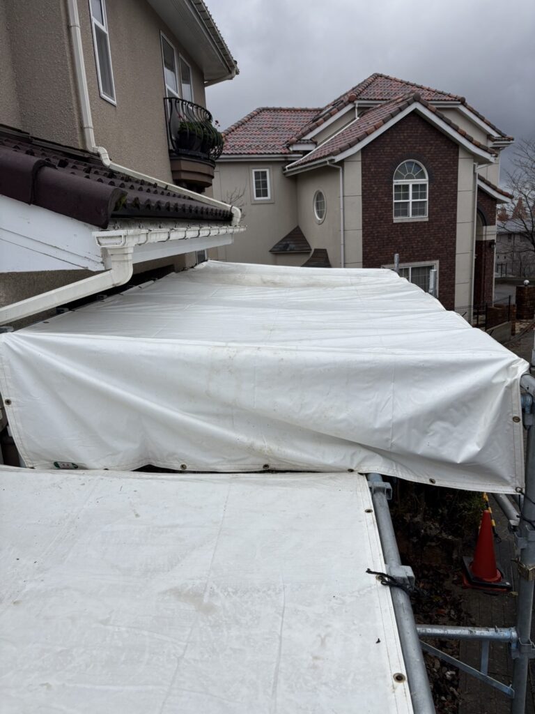 皆さま、お世話になっております。石川県白山市にて先日組立した増築足場の下屋根部分の組立を行いました。下屋根部分に組立する際は屋根を傷付けないよう養生を念入りに行い組立致しました✨ 金沢市
