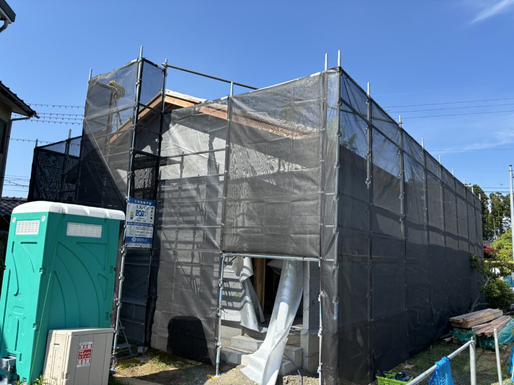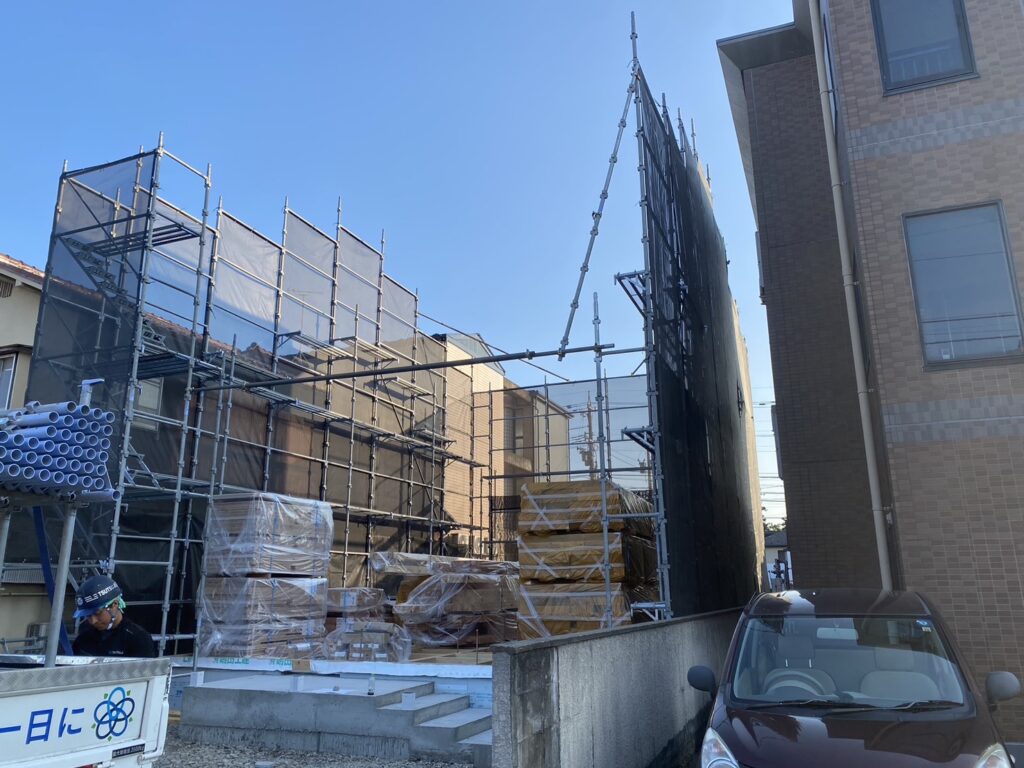皆さま、お世話になっております。石川県金沢市にて、住宅の新築先行足場を組立致しました。先行足場は建物が立つまで風を受けやすく、足場を固定する控えは入念にとる必要があります。安心、安全、作業のしやすい足