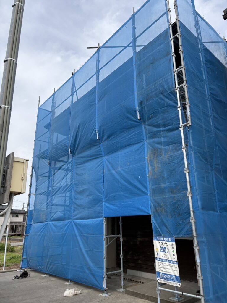 皆さま、お世話になっております。石川県内灘町にて、新築住宅の先行足場を組立致しました✨新築先行足場の外部養生シートは風をうけやすく、足場が倒壊する恐れがあります。そのため最初はシートを丸